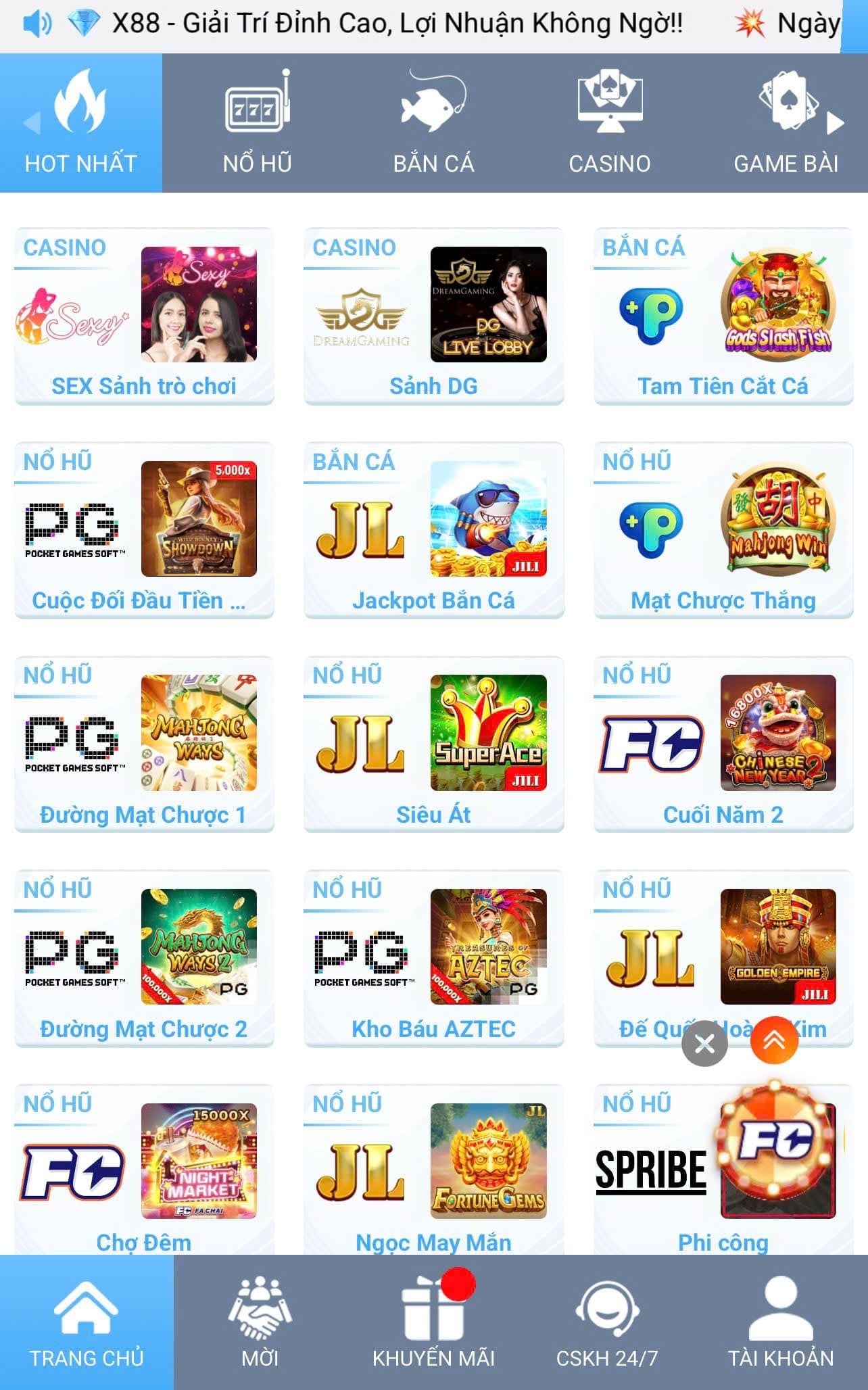Sảnh trò chơi cá cược Slot – Bắn cá tại x88019.com với hàng loạt trò chơi hấp dẫn, xanh chín, Jackpot lên tới hàng tỉ đồng mỗi ngày. Nhận thêm tiền thưởng cực khủng khi tham gia.